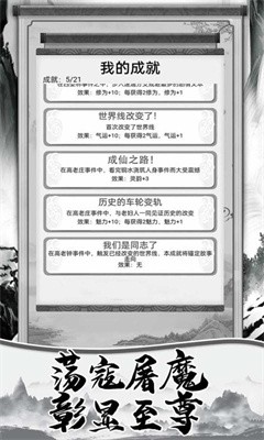 3.每次完成修仙后可以获得不同的成就,每个成就可以对你的角色进行加成,让你更轻松地完成修仙挑战。