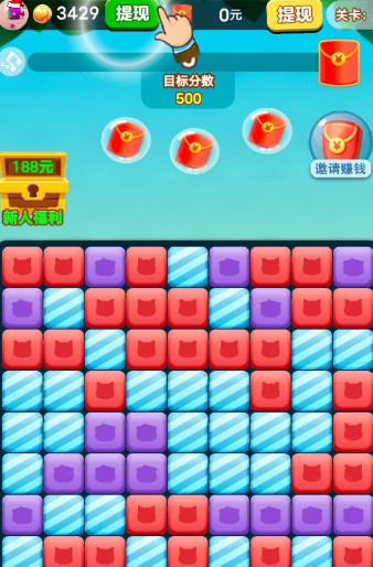 2.完成消除闯关,每过一关都可以拿红包,达到指定分数就可以通关。