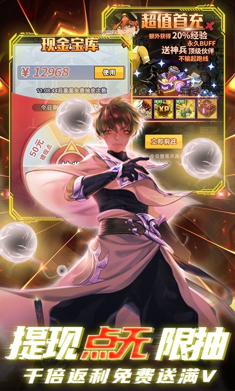 6.上线送V10,超强伙伴,充值比例1:1000,首充多倍充值。