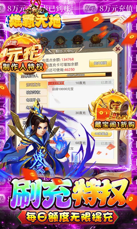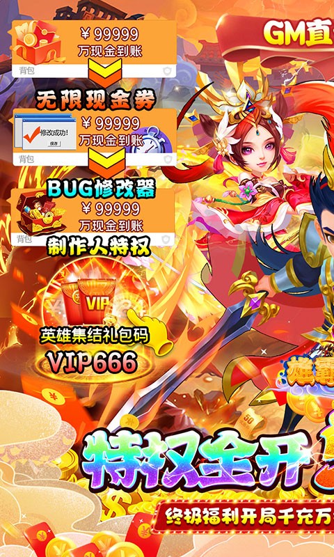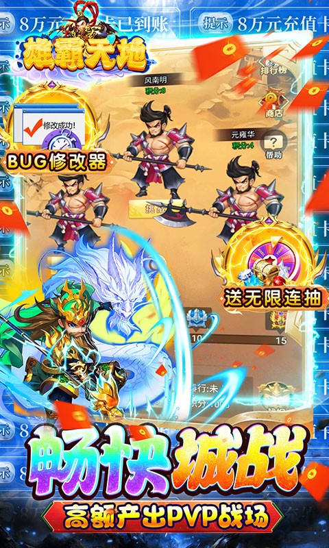 雄霸天地刷充特权是一款三国版本的策略手游,雄霸天地刷充特权为大家破解了刷充特权,玩家上线就可以领取千抽礼盒和万元真充卡,还有GM1特权登录就能领取,累计登录还有十星武将和万元连抽,上线输入礼包码VIP666还能再领英雄和资源。