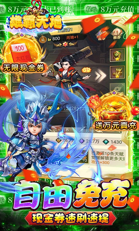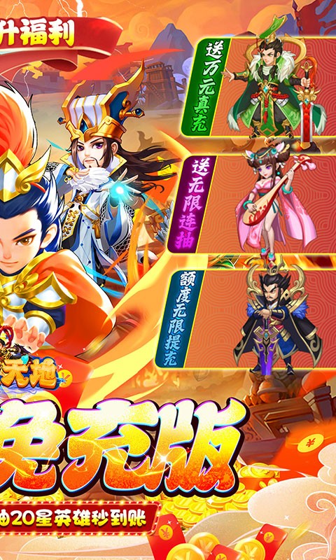 全新版本福利来袭,开局送破解器兑换,游戏内有大量【现金券】激情刷充, 可代替RMB购买礼包和充值,登录即送20星神将,千抽礼盒,万元真充直接到账,阵容打造开局即巅峰! 全新体验回合爽游,各种PVP城战,PVP跨服玩法更有稀有破解道具和顶级礼包相送。 不光能体验到驰骋三国的快感,同时轻松升战养成霸榜。
