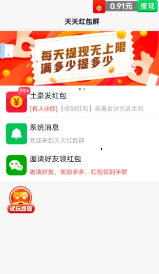 招财红包是一款可以抢红包的小游戏,再招财红包中,有一个每天都有土豪发红包的群,玩家登陆即可进入该群聊,群里的每个红包都可以领取,观看视频的话可以领的更多,另外还有一些小游戏试玩任务可以参与,玩游戏也能赚到钱。