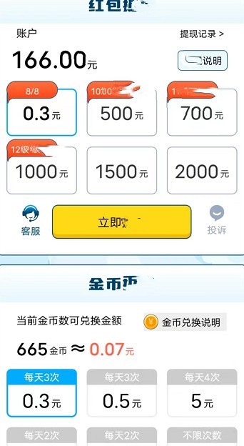 3.金币按照兑换方式进行提现,金币的小额提现机会更多,更容易提零花钱。