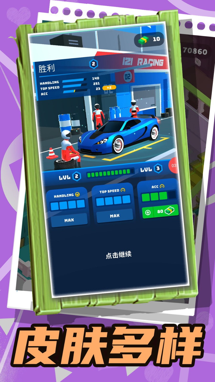 1.有多种汽车可以解锁,并且皮肤多样,快来为你的汽车装饰,成为比赛中最炫酷的存在吧。