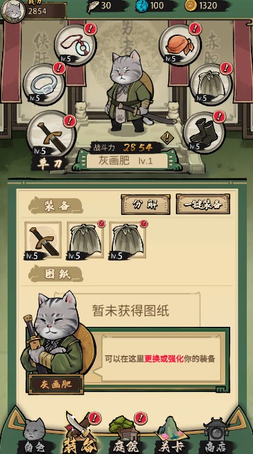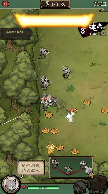 2.不仅有各种武侠猫咪角色,还有非常多的装备武器可以选择,闯关或是前往商店还能解锁更多装备。