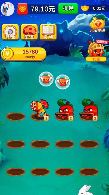 1.每一种水果都有对应的收益,每次升级都能获得红包和元宝奖励。
