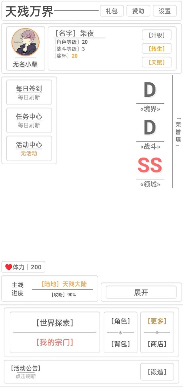 天残万界,一款文字风格的拯救世界游戏。天残万界游戏中玩家可以通过更多的选择,来提高自己的能力,展开剧情故事,这里还有大量的属性任务为你带来拯救世界的乐趣。游戏挑战任务很多,你的选择非常重要,提升修为,完成冒险,拯救世界。
