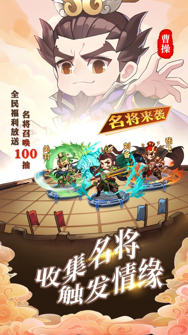 1.有超多三国武将可以收集选择,上线就有100连抽,武将之间还存在情缘羁绊,在阵容搭配中发挥不同的作用。