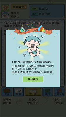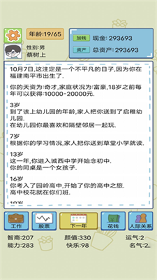 1.选择合适的属性,进入游戏开启全新的人生,不断随机各种人生故事,在不同的人生阶段作出不同的选择。