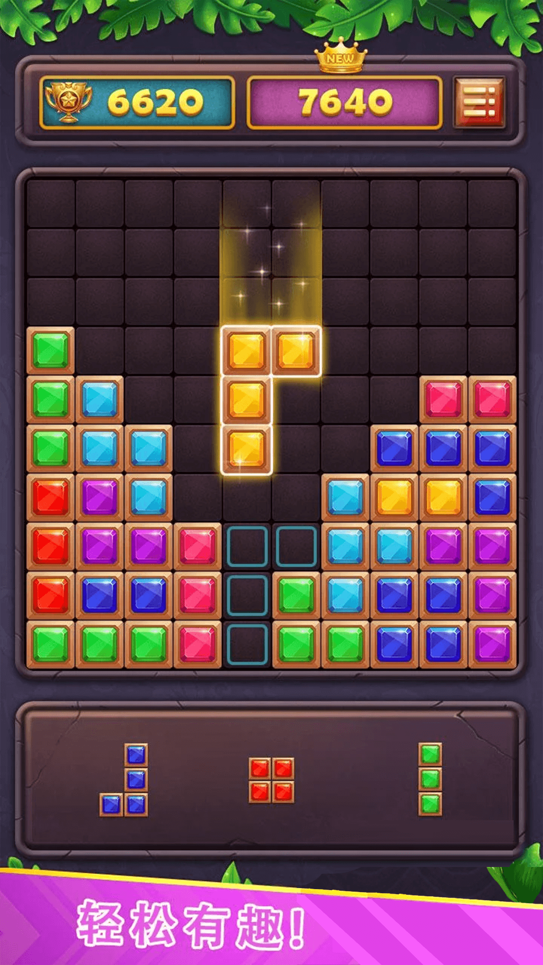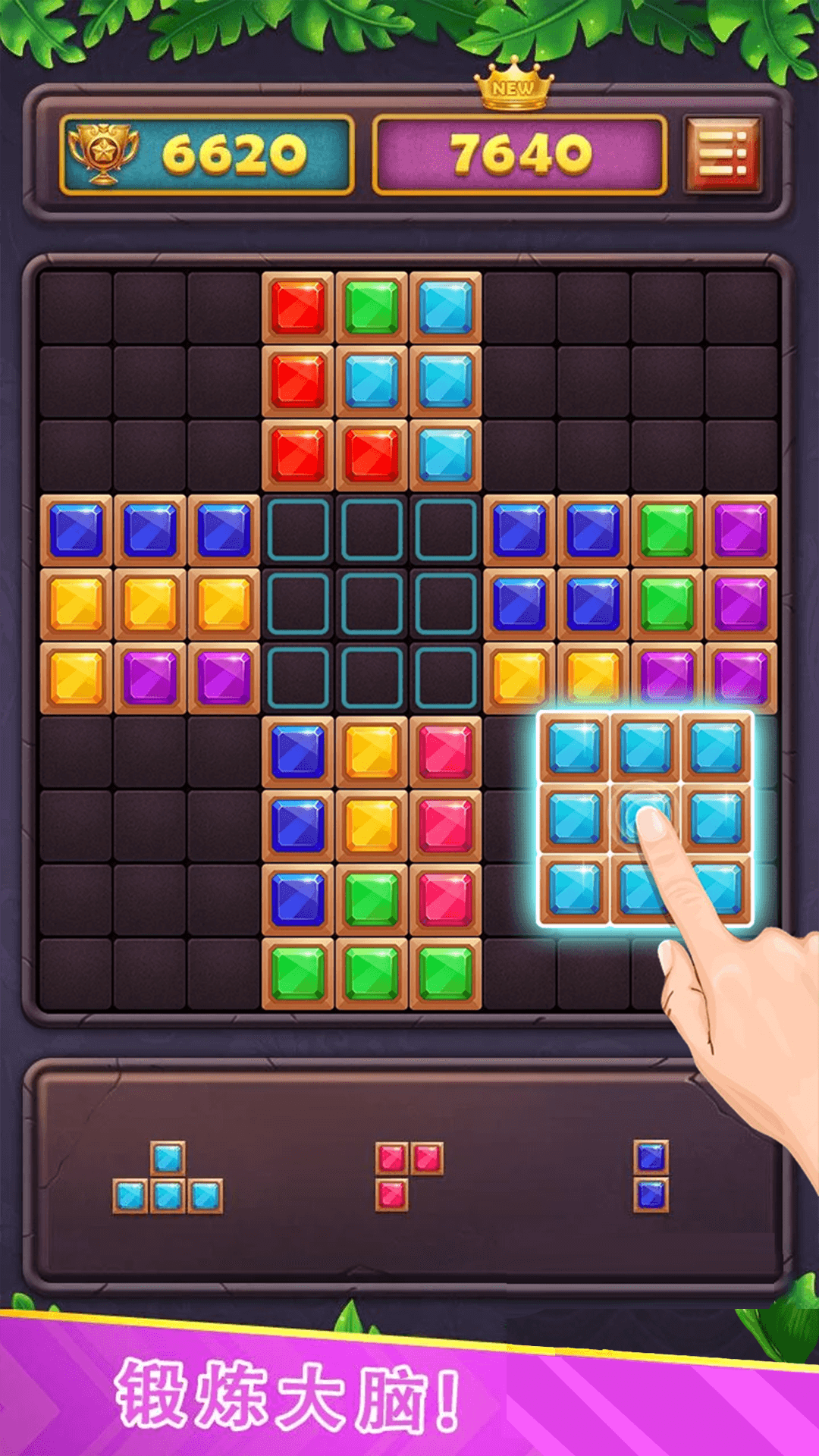 1.将屏慕下方的三个方块拖入宫格中,一行或一列铺满即可消除,简单又快捷。
