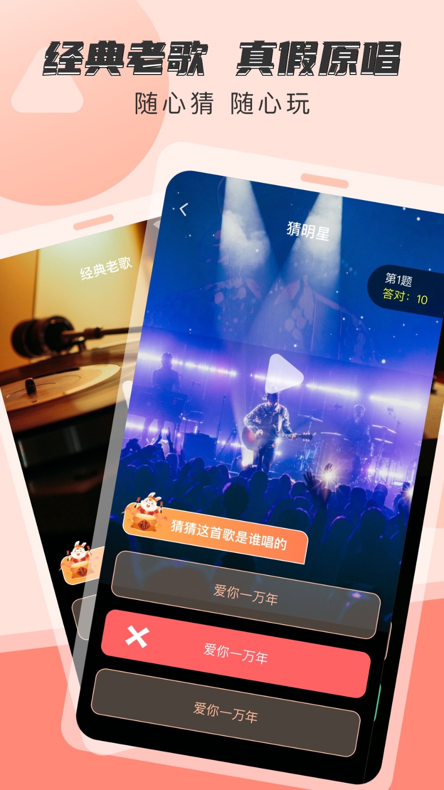 1.根据视频音频来猜出歌曲的名字或者歌手,猜歌名有三个选项,才歌手有两个选项。