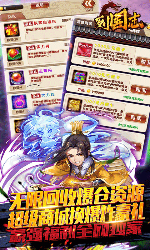 列国志定制超级商城是2023全新武侠卡牌手游,高精度武侠题材内容致敬经典武侠世界,丰富剧情勾起你的武侠情怀,上线就可以领取GM特权享无限资源,升级还可以免费领取8万真充卡,无限回收爆仓资源,毕业礼包开局就送。