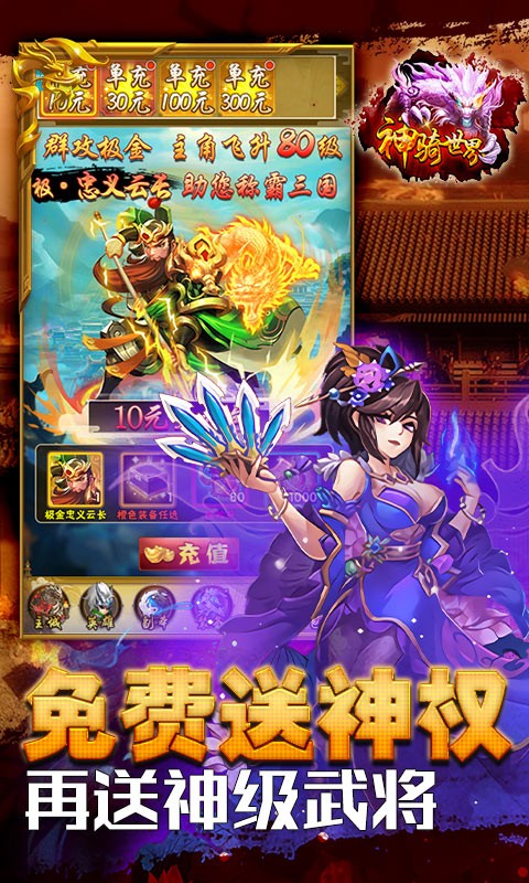 神骑世界送GM神权是一款三国策略卡牌手游,神骑世界送GM神权以三国时期为背景,玩家可以开创自己的阵营,上线即赠送GM神权,海量资源好礼免费领,还有千元真充卡和代币礼包可以获得,每日还有无限资源可以领。