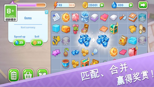 1.匹配图案,合成物品,装饰自己的房子打造理想之家。