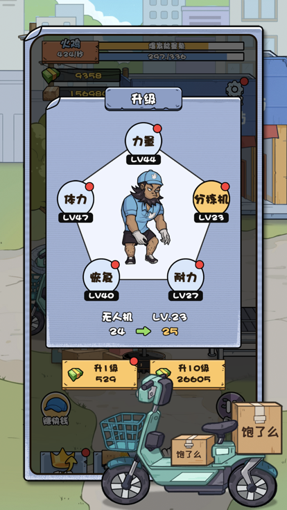 2.不断提升自己的等级,从力量、体力、耐力、恢复和分拣机五个属性方面进行提升。
