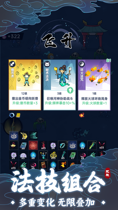 2.局内多样的法宝和功法相互搭配,特殊的法宝、功法之间还可触发羁绊开启宝箱合成超级法宝。