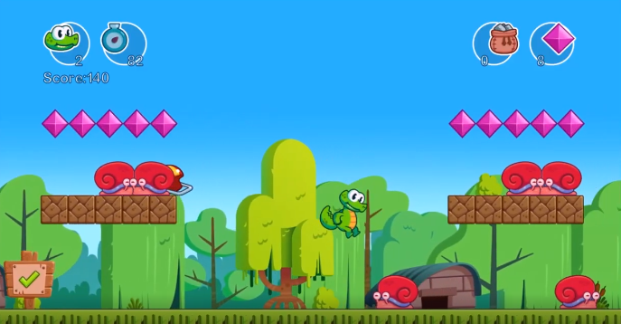1.控制小小的鳄鱼进行跳跃前进,有很多的障碍阻碍你们,但是路途之中也有很多的金币和道具可以捡拾。