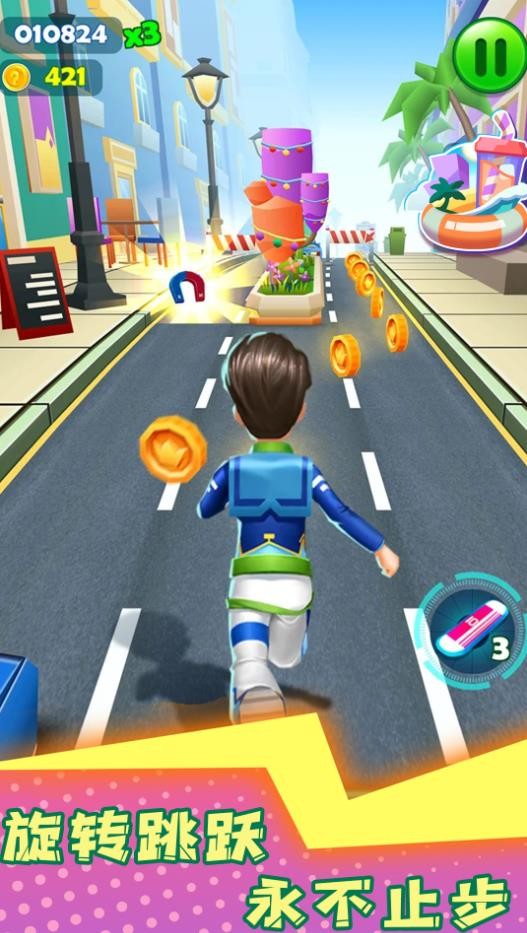 让大家在这里操控角色的加速度的跑酷游戏,类似地铁的奔跑冲刺关卡,让玩家在遇到线路上的各种危险障碍物时,可以灵活操控虚拟键盘进行躲避,灵活做出应急反应和冒险。