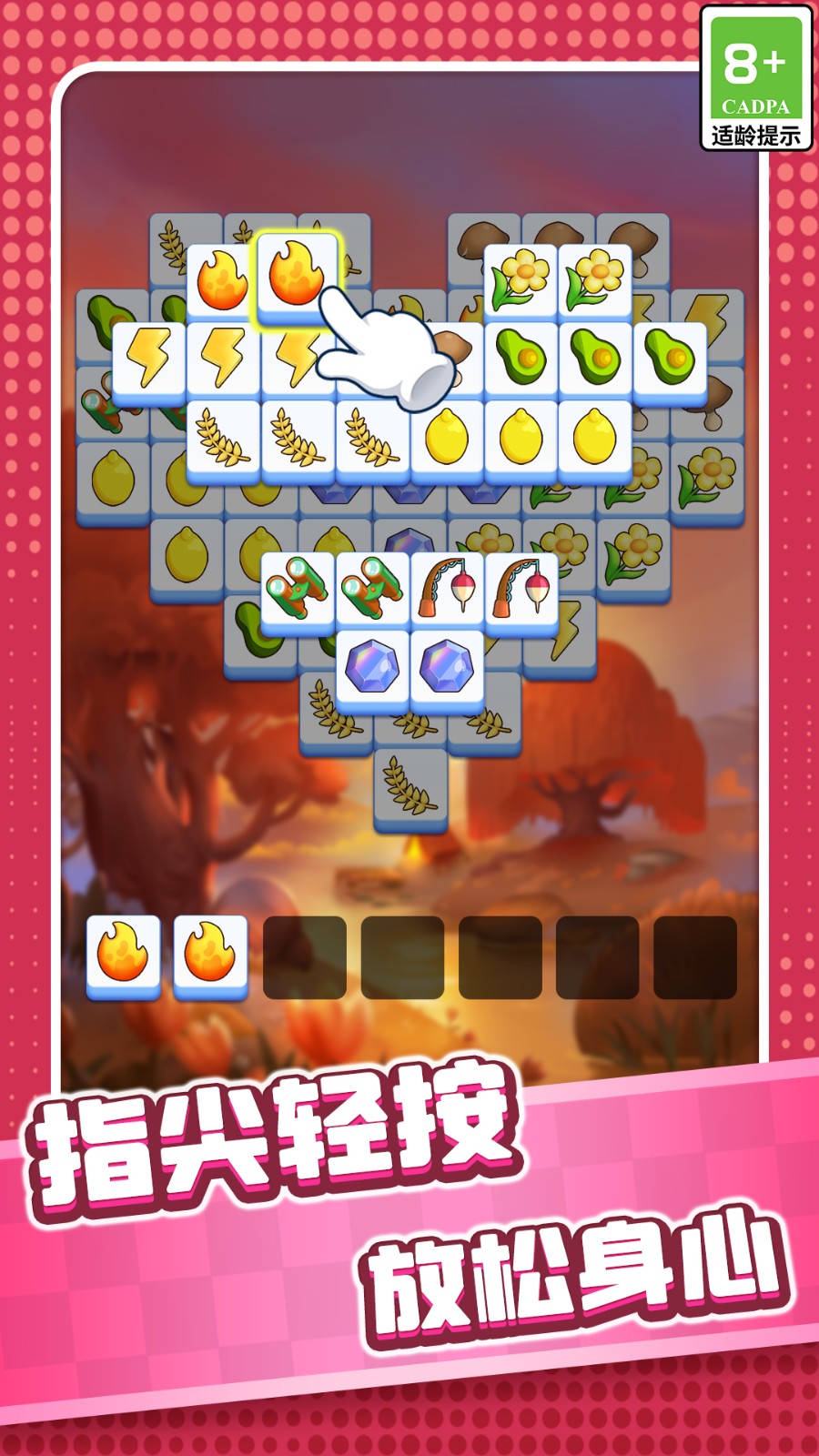 2.玩家将点击方块,让三个相同图案的方块放进盒子里就能自动消除。