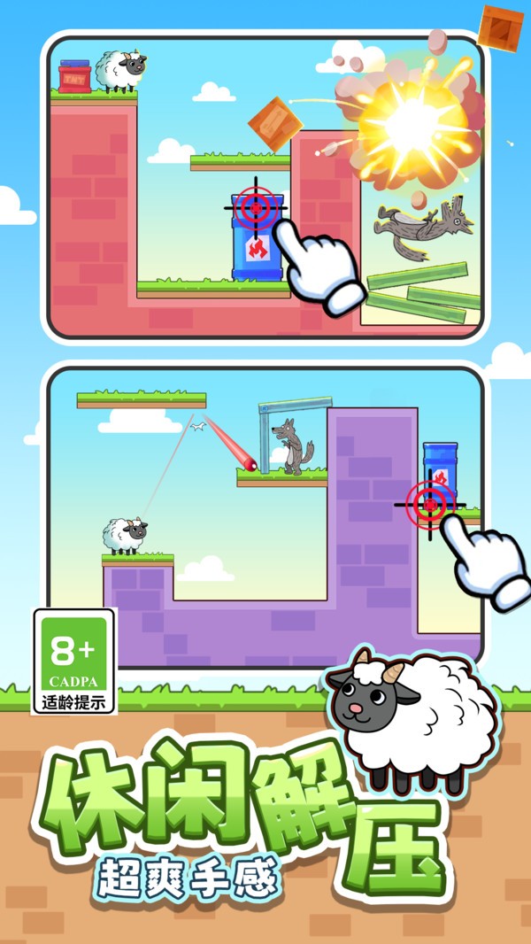 这是一款益智益智游戏,可以锻炼您的思维,当你进入游戏时,你将参与许多挑战,这里的主角是羔羊,而狼群将成为反派,你在这里要做的是在狼群的守望者的带领下解救这些被困的小羊,整个游戏需要玩家不断思考,利用给你的道具打败这些出现的狼群。