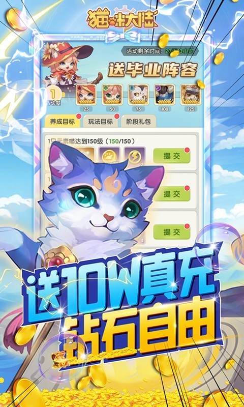 猫咪大陆送GM毕业阵容是一款以猫咪为角色形象的策略回合制手游,在猫咪大陆送GM毕业阵容中有众多可爱猫咪英雄可以收集,玩家上线即送GM毕业阵容,还有GM刷充特权可以免费解锁直购,升级还有10万真充。
