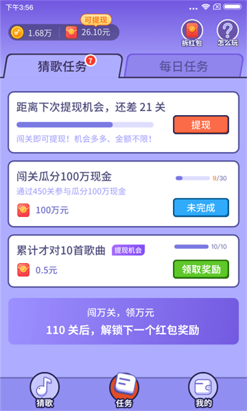 3.有猜歌任务和每日任务都有对应的红包可以拿,通过450关可以瓜分百万现金。