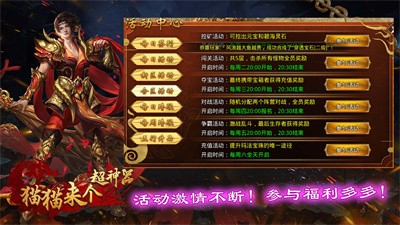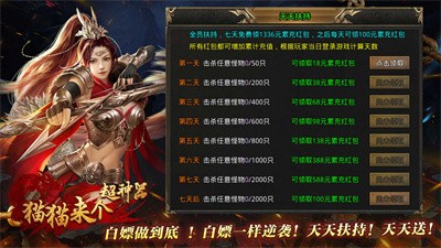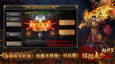 猫猫来个超神器是一款1.85神器传奇手游,全新神器版本,轻松白嫖顶赞,领取超多特权,上线还有超多好礼等你来拿。在猫猫来个超神器中,自动拾取,自动回收,背包全开,仓库全开。