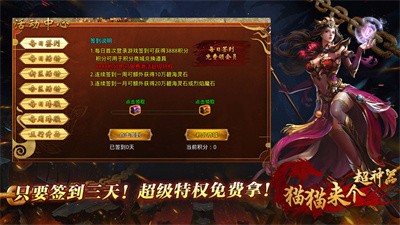 1.签到就送超级特权,免费获得累充,轻松获取技能、材料、货币等物品,让你尽情享受传奇的畅爽。