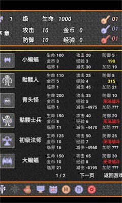 1.在魔塔中进行探索冒险,收集各种物品,击败每层的怪物,获得奖励不断升级,感受刺激冒险。