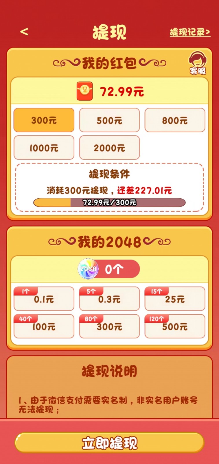 1.累计的红包达到300时即可提现,而在期间如果达到指定合成分数可以获得直接提现机会。