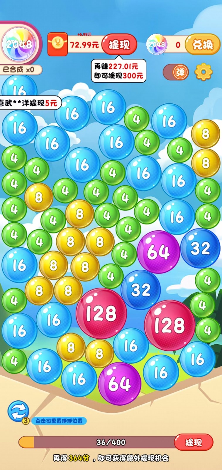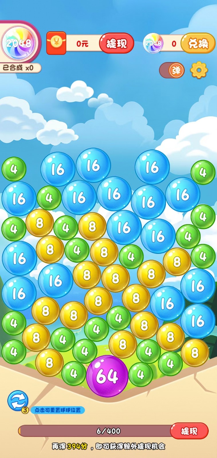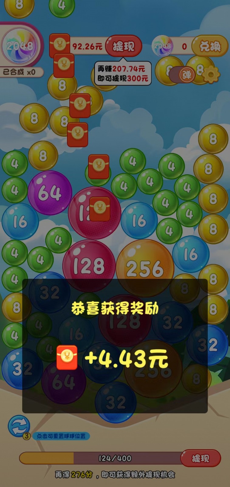 2.每合成新的小球都能获得红包奖励,一次2048的合成过程可以赚到大量的红包。