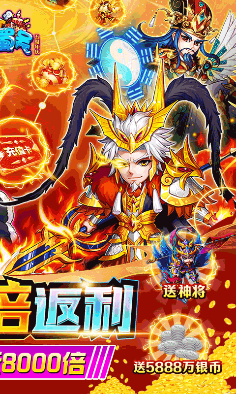 2.充值比例1:8000,首充三倍钻石返利,首充即送神赵云,七星超强武器和元宝哦;