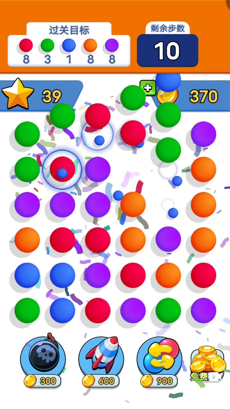 1.小球消除玩法,在有限的步数内消除目标数量的各种颜色小球。