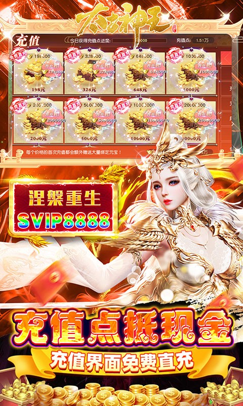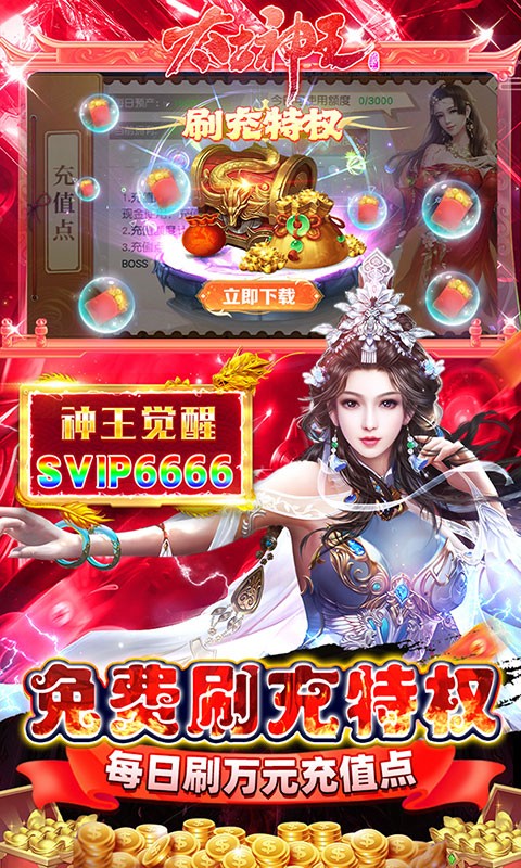 太古神王充值点无限提取是一款玄幻动作类手游,太古神王充值点无限提取由同名人气网络小说正版授权,玩家上线即可免费领取百万充值,免费刷充特权无限提取,上线还有超级丰厚的福利礼包可以免费拿,输入礼包码SVIP9999再领福利。