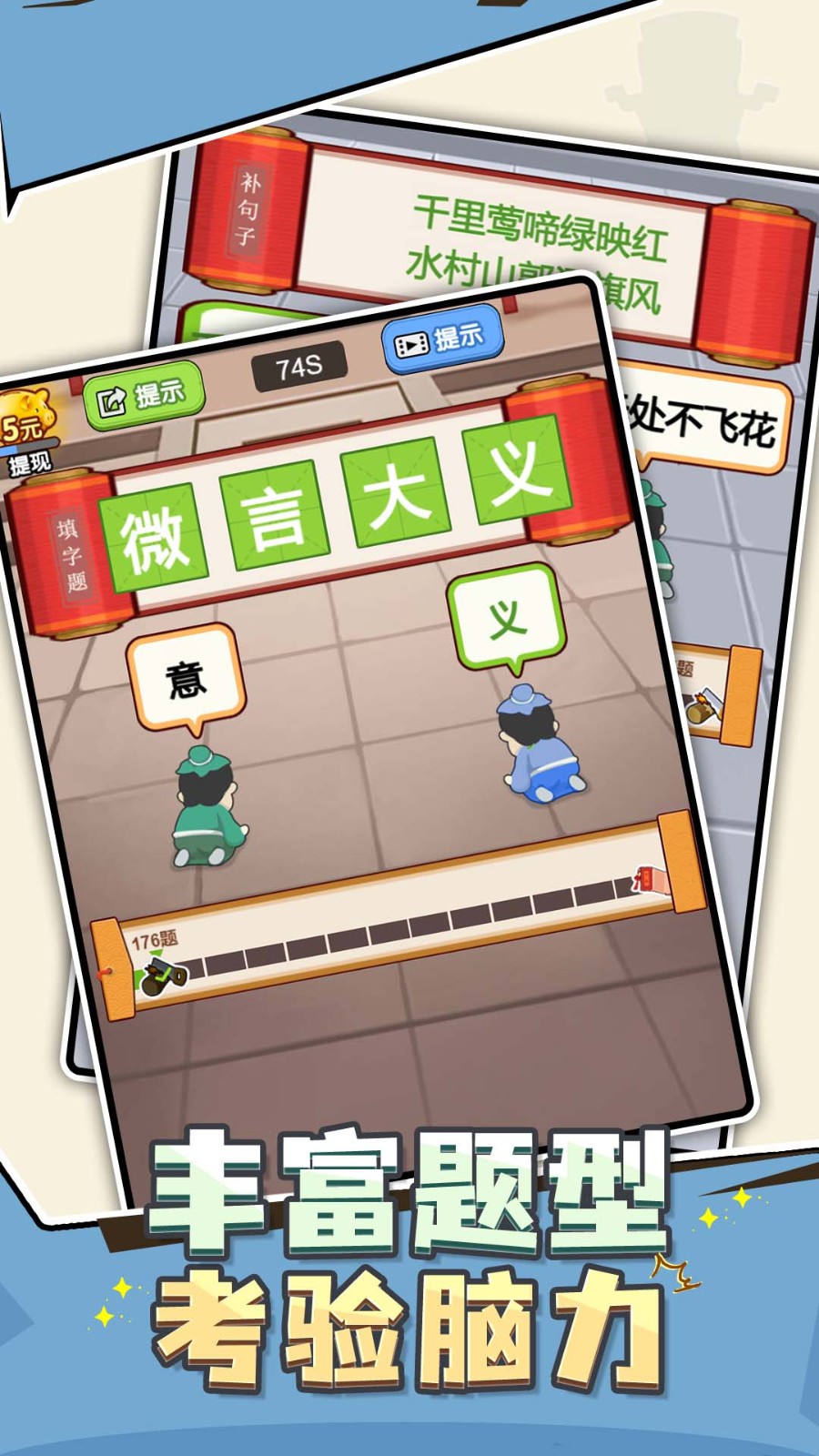 1.玩家将深入探索不同的目标,增加自己的文化底蕴,提高知识造诣,面对随机出现的成语也不足为奇。