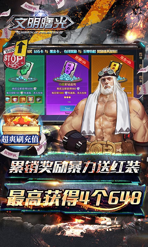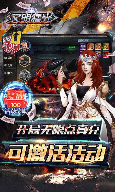 文明曙光欧皇无限点充是一款科幻题材的废土冒险手游,在文明曙光欧皇无限点充中,玩家上线就送百张黑金卡,真充钻石随便开,开局还能无限点充648,可以免费激活充值,还有GM特权可享各种福利资源和稀有时装。