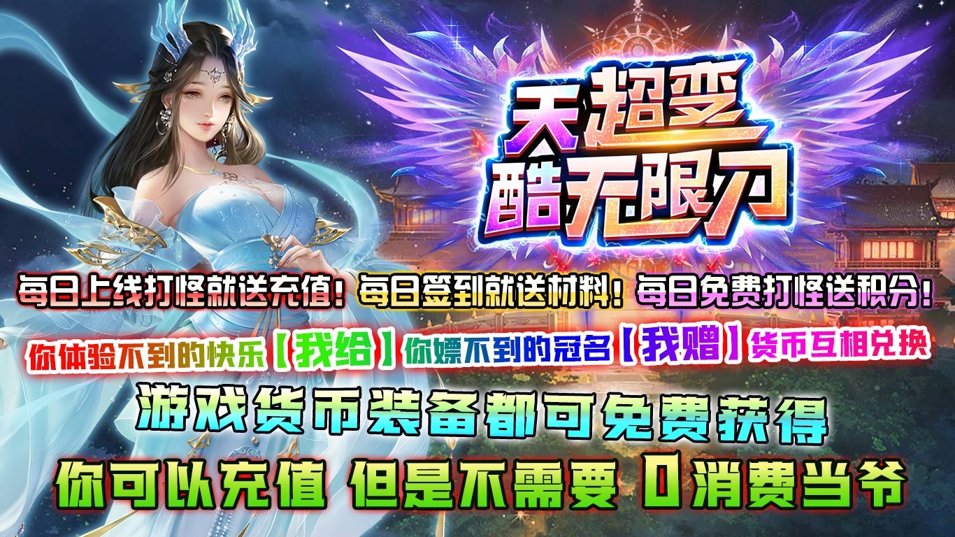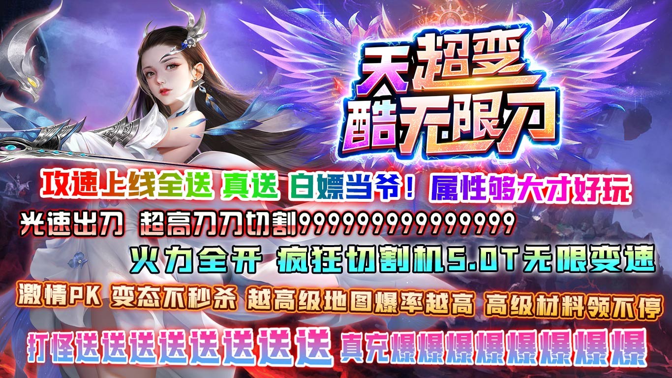 天酷超级无限刀是一款超变无限刀传奇手游,在天酷超级无限刀,玩家上线就送攻速、切割等属性,疯狂切割机5.0T无限变速,地图越高级爆率越高,每日上线还有真充可以领,材料、货币全部免费打,打怪还能爆真充,免费毕业散人天堂。