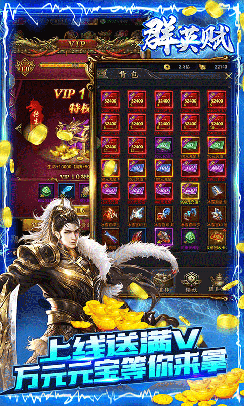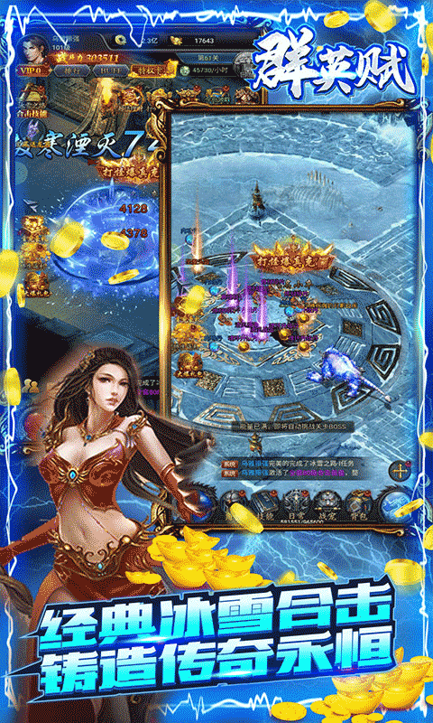 群英赋online冰雪湮灭刷金是一款复古冰雪三职业传奇手游,群英赋online冰雪湮灭刷金以端游为基础,继承经典玩法内容以外还加入了自由PK、沙巴克攻城玩法,上线就送满V,还有2000元充值卡,闯关得真充红包碎片,七日登录送神器破魂,享永久攻速加150%,输入礼包码VIP888、VIP999直升100级。