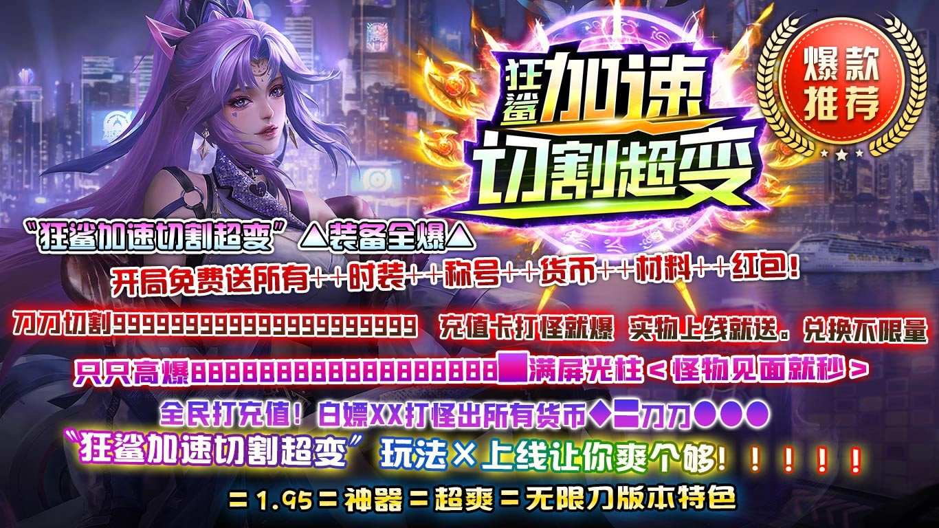 狂鲨加速切割超变是一款195超变版本的传奇游戏。在狂鲨加速切割超变中,上线就能让你玩个够爽,1.95版本的经典玩法和独特的神器玩法相互融合,全屏幕BOSS切割激爽不停,无线攻速刀刀光柱,超高爆率让你享受绝无仅有的震撼感受。
