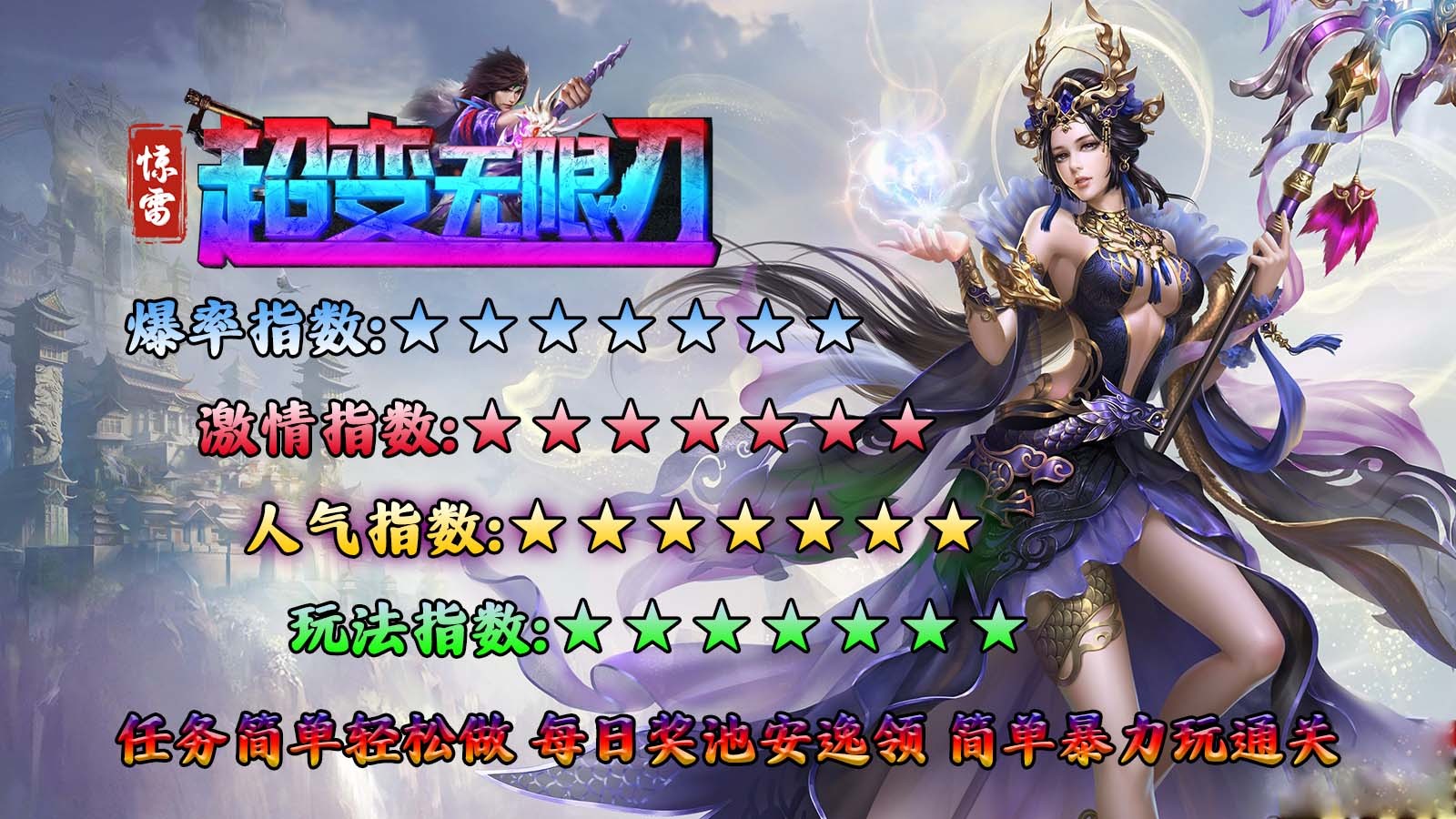 惊雷超变无限刀是一款刺激无限的传奇游戏。在惊雷超变无限刀中,人性化的自动系统为玩家的体验感保驾护航,全屏吸怪切割,感受超强攻速带来的无限快感,特色地图不断出现,怪物非常好打,感受无限激情的战斗吧!