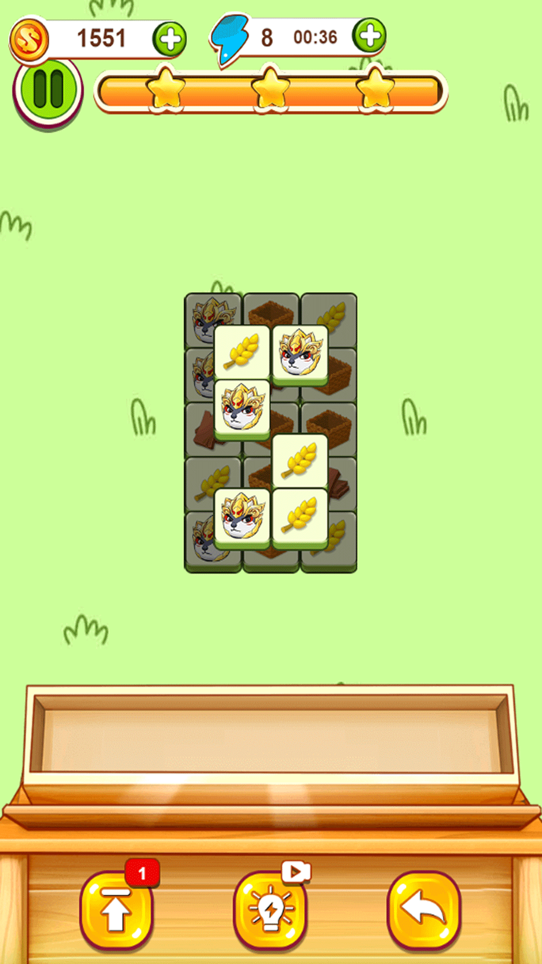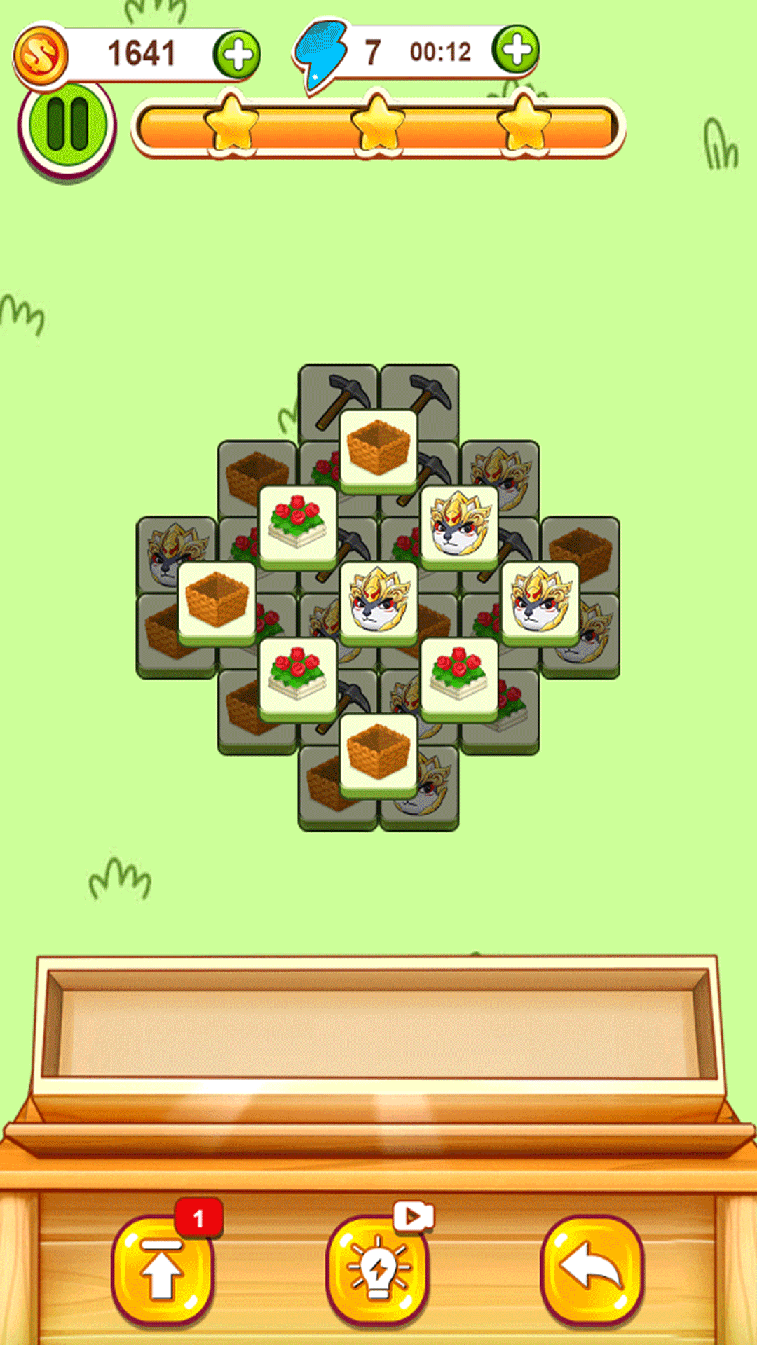 2.在游戏下方共有7个槽位,玩家只要把3个相同方块点到槽位中就会消除,占满方块则失败。
