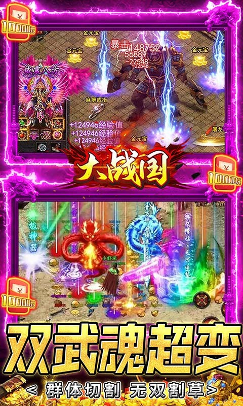 大战国双武魂超变是一款超变武魂传奇手游,在大战国双武魂超变中,玩家创角就送终极神器和全套终极技能,还有全屏吸怪、群体切割等、自动回收等技能可以免费获得,打怪就有真冲卡,一秒十刀就是爽