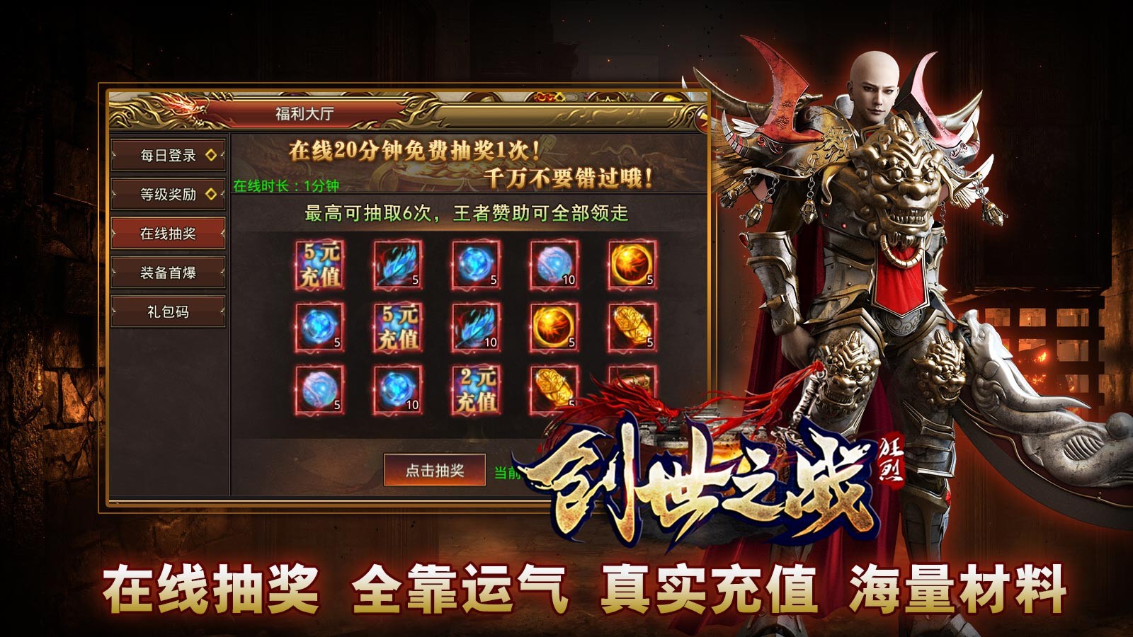 1.真散人可以玩的传奇手游,每天上线送充值,还有在线抽奖,充值、材料全部送