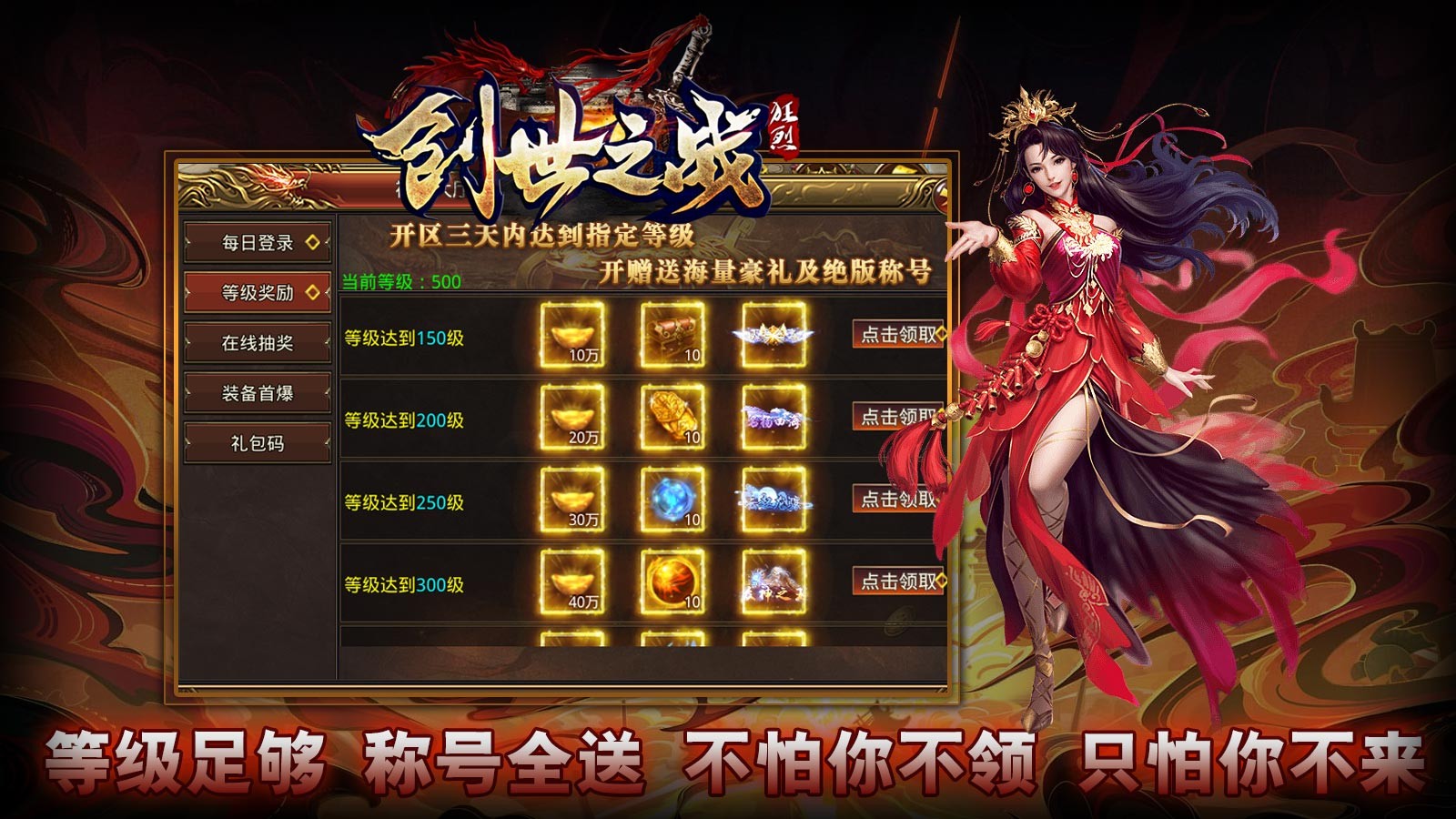 3.每日在线或是升级就能够获得各种绝版称号以及还来给你豪礼礼包,全部都能免费领取