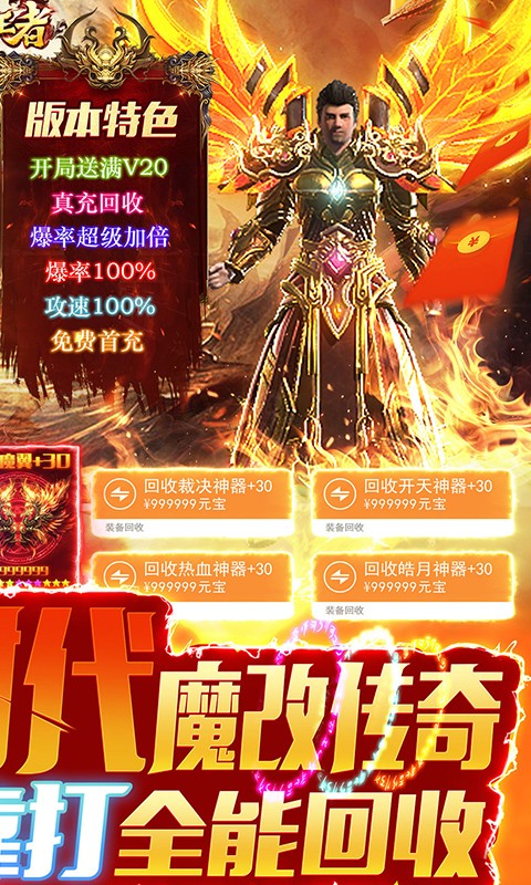 诸世王者魔改回收撸30W是一款魔改传奇手游,在诸世王者魔改回收撸30W中有万能回收系统,装备全部靠打,爆率上调100%,魔改回收轻松收菜,登录就送免费首充,完成任务直接升满级VIP,打BOSS还能掉落真冲卡