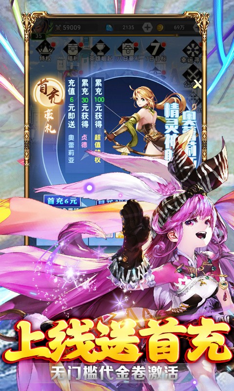 2.上线送首充,免费领取精灵神射手,五星英雄碎片;