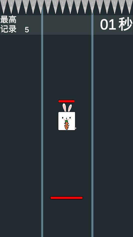 我行我兔是一款需要玩家反应的趣味小游戏,在我行我兔中,玩家要操控小兔子不断往下方的横线上跳,千万不能被顶端的锯齿戳到,否则就算闯关失败,和是男人就下一百层玩法类似,很考验玩家的反应力