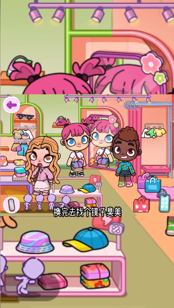 一个五彩斑斓的时尚服装店,有各种各样好看的服装可以试穿,还有不同的姿势可以展现服装,还能对着镜子摆弄各种pose