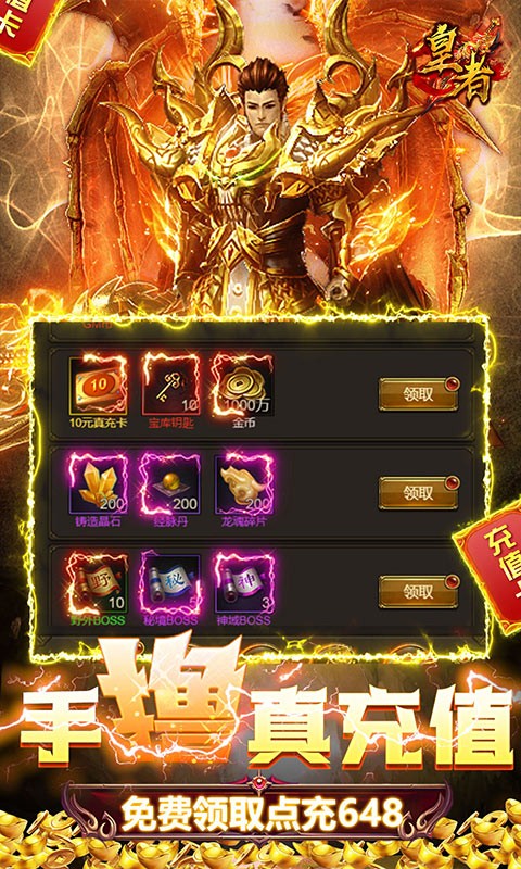 皇者0氪爽爆充是一款高爆高福利打金手游,在皇者0氪爽爆充中,玩家击杀任意BOSS即可获得真充,零氪可以获得无限资源,上线就有VIP和GM特权,还送绝版时装和648真冲卡,所有资源装备全部靠打