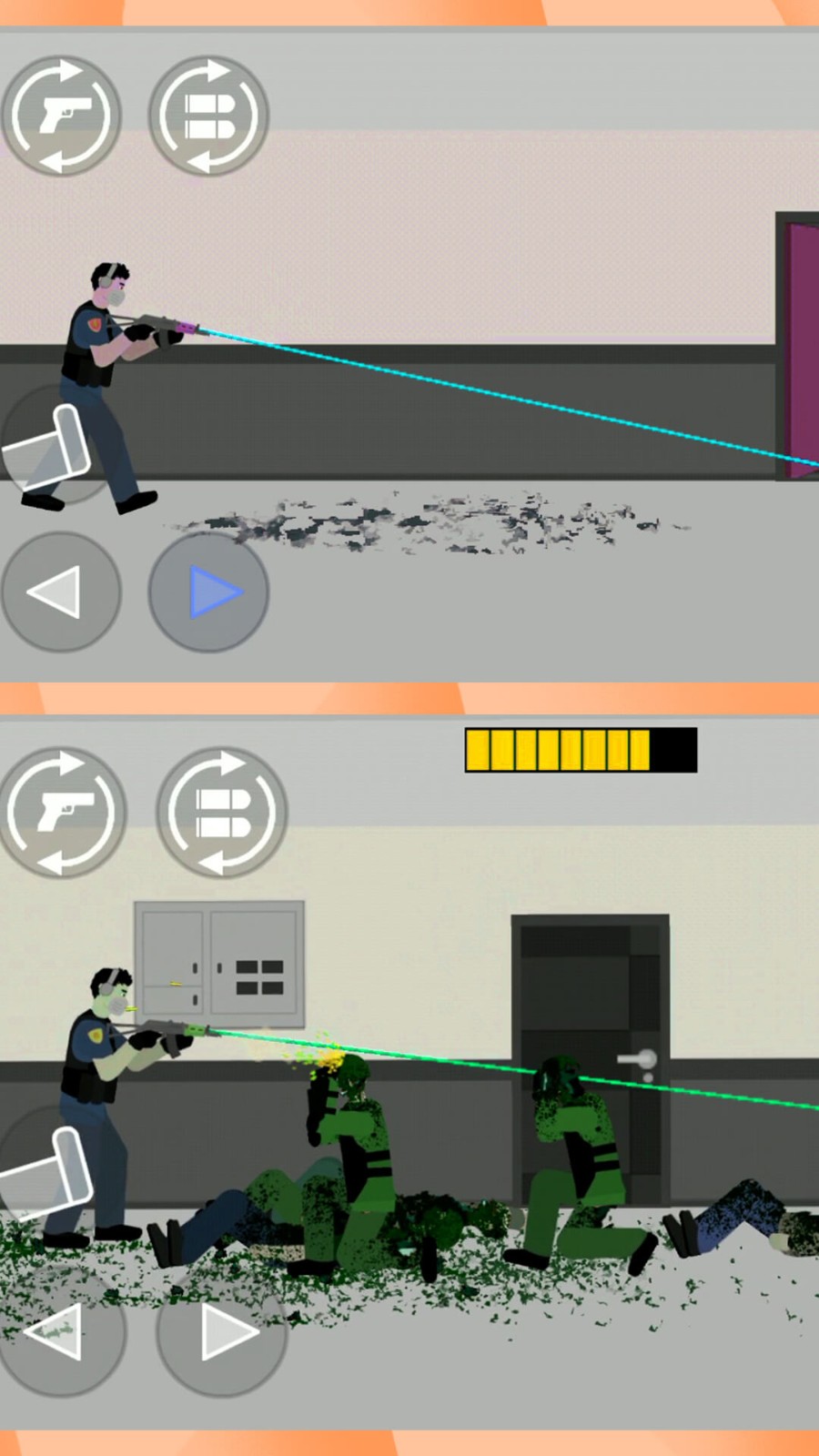 1.射击战斗画面非常独特有趣,一旦僵尸被你射杀,它们就会变成颗粒一样的东西,慢慢消失。